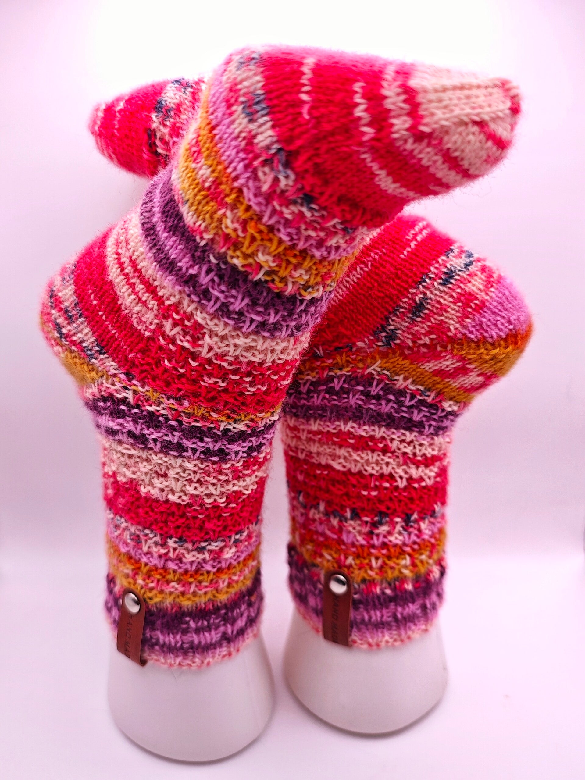 Diese liebevoll handgestrickten Socken begeistern mit einer lebendigen Farbmelange aus Pink-, Rosé- und warmen Beerentönen. Das harmonische Streifenmuster macht jedes Paar zu einem einzigartigen Unikat.
