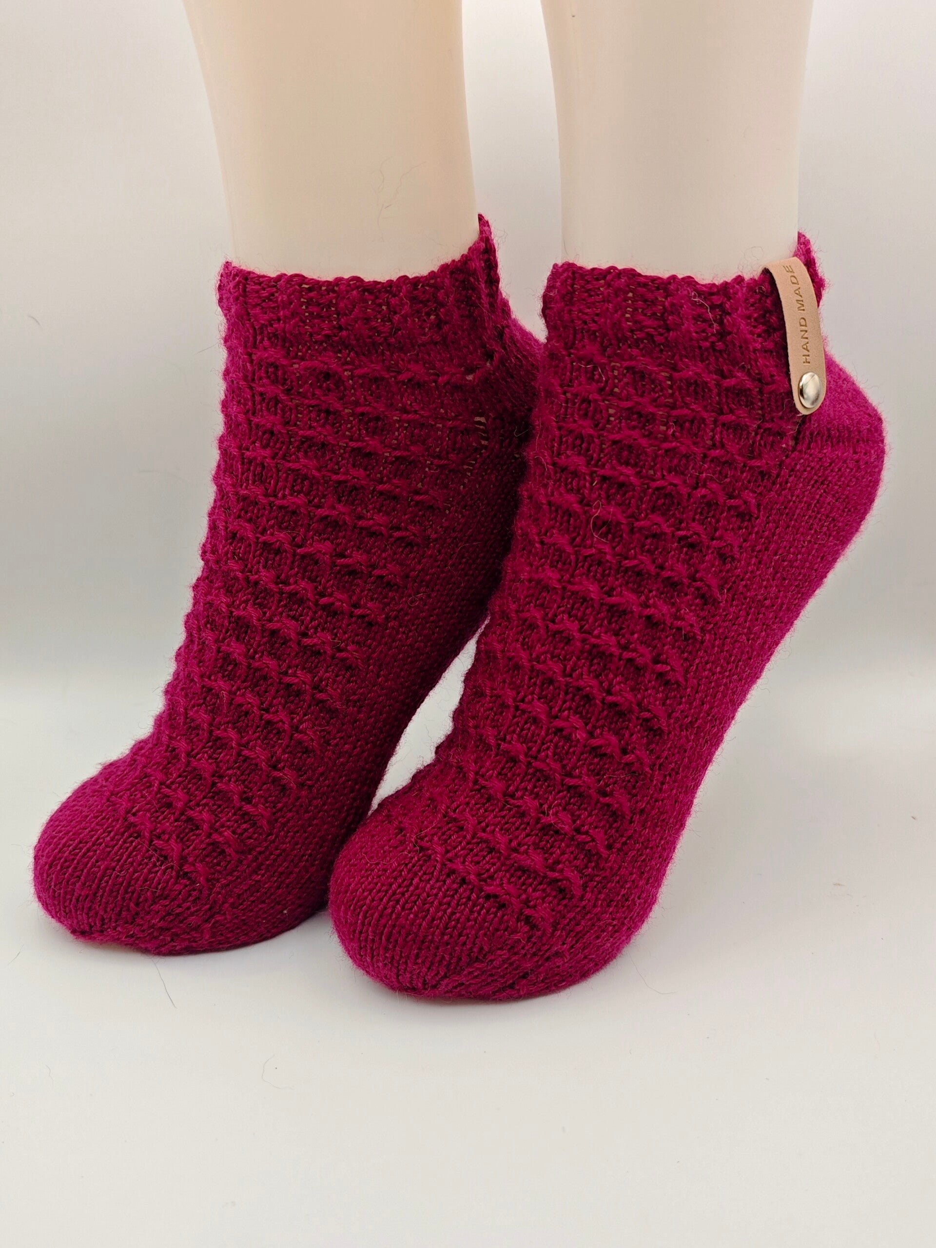Diese handgestrickten Socken begeistern mit ihrem intensiven Beerenton und dem feinen Strukturmuster, das ihnen eine elegante Optik verleiht. Sie sind weich, angenehm zu tragen und sorgen dank Merinowolle für ein ausgeglichenes Fußklima – wärmend im Winter und angenehm kühl im Sommer.