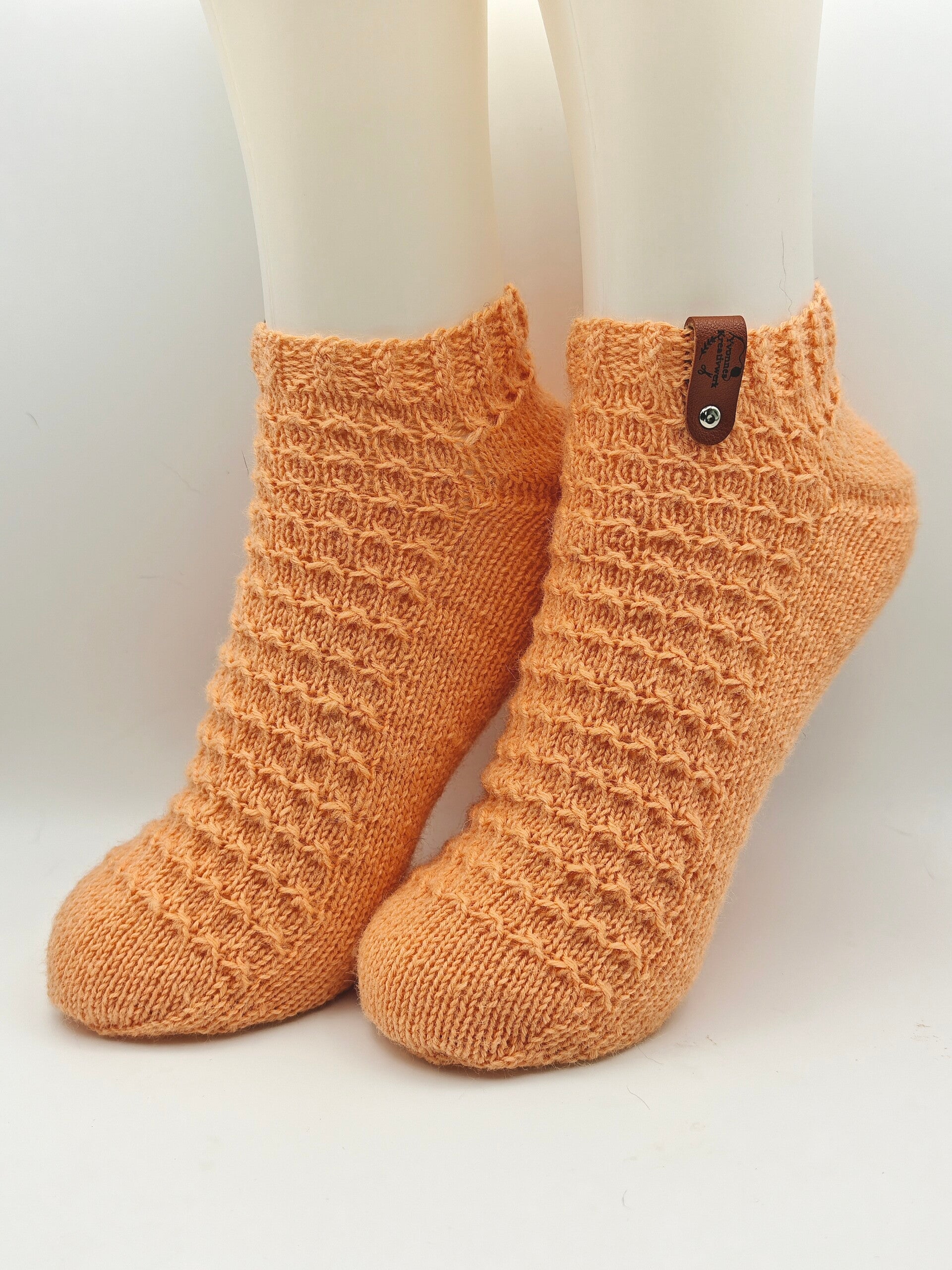 Diese handgestrickten Socken begeistern mit ihrem warmen Apricot-Ton und dem feinen Strukturmuster. Die dezente Optik macht sie zu einem zeitlosen Begleiter für gemütliche Stunden zuhause. Sie sind weich, angenehm zu tragen und sorgen für wohlige Wärme an kühlen Tagen.